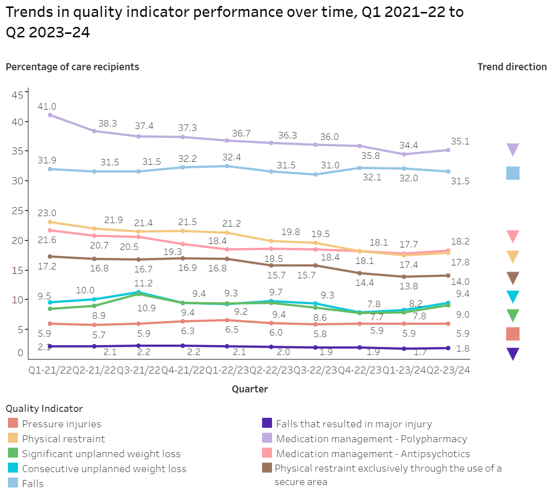 For the December quarter, data from 2,536 aged care homes was included in the QI Program. The QI Program commenced from 1 July 2019, was expanded on 1 July 2021, and then expanded again from 1 April 2023 when six new QIs (activities of daily living, incontinence care, hospitalisations, workforce, consumer experience, and quality of life) were introduced. Download the QI Program data for the December 2023 quarter here.