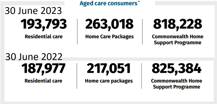 The Home Care Package Data Report for the March 2023 quarter, which came out last week, reveals there were nearly 250,000 people with a Home Care Package, a 40,000 or 19% increase on the previous year. In addition, the latest home care data, which is released by the Department of Health and Aged Care, shows nearly another 20,000 people had been assigned a Home Care Package. The June 2023 quarter data, which was contained in the Department of Health and Aged Care's latest 88-page Sector Performance Report, which also came out last week, shows home care numbers continued to rise strongly. By the end of the June quarter there were 263,000 home care consumers, up 21% over the year. (By contrast, the number of residential aged care consumers rose only 3% over the year to 194,000.)