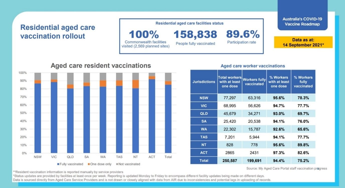 94.4% of aged care workers had received their first dose of COVID-19 vaccine on 14 September, according to Federal Government data supplied by providers, leaving more than 22,500 unvaccinated with the mandate deadline on Friday, despite calls from the nurses’ union to extend the vaccination push for two weeks.