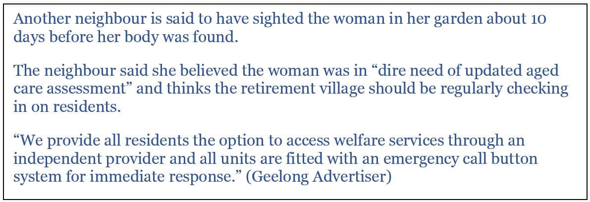 Whatever the case, village residents are getting older and therefore frailer. Increasingly it is difficult for village operators to state that residents are ‘independent’ and therefore the operator does not have a ‘duty of care’.