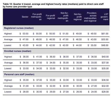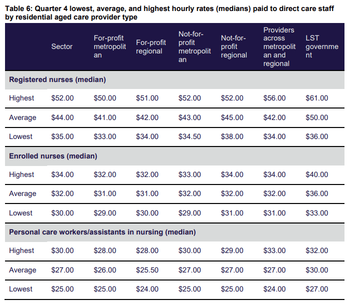 Nearly half or 47.6% of Australia's aged care residents were serviced by profitable aged care providers, compared with only 26.8% in the first quarter of the 2023 financial year. Overall, the residential aged care sector returned a net loss before tax of $924 million for the 2023 financial year. Wages data Hourly aged care pay data for the lowest and highest rates was included in the QFS for the first time, providing comparative data for wages data from 1 July 2023, when the 15% pay increase was awarded. In the fourth quarter, the median of the average hourly rate for the sector was: