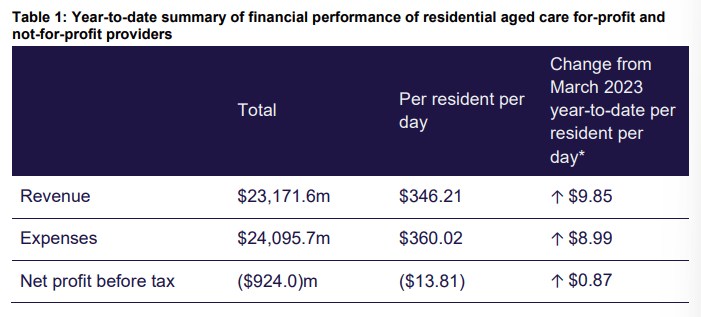 Providers recorded a net loss before tax of $13.81 per resident per day in the year to June 2023, according to the Department of Health and Aged Care's latest QFS, an improvement of $0.87 per resident per day from the year-to-date March result.