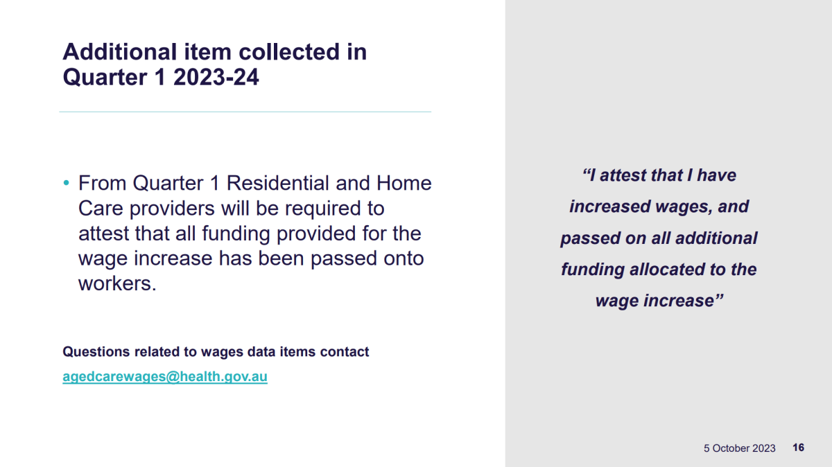 From the first quarter of 2023-24, providers will also be required to attest that all funding the Government provided for wage increases has been passed on to workers for wages and associated costs.