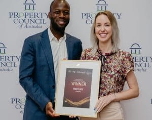 Emily Bey (pictured right with Bruce Djite, Executive Director, Property Council, SA), of Levande, won the SA/NT Award for Salesperson of the Year.