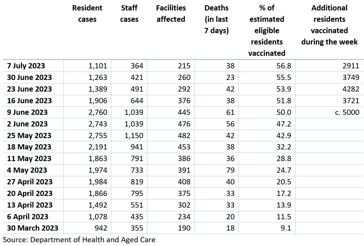As of 5 July 2023, of the aged care residents who have been eligible for a booster shot since January 2023, 86,199 or 56.8% of eligible residents have now received their 2023 booster dose.