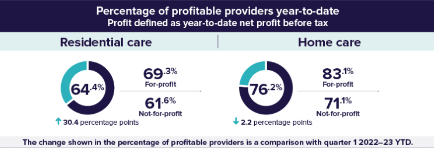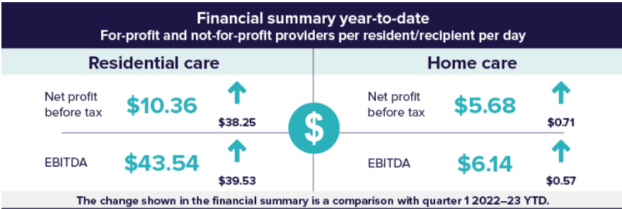 2622 For Profit and Not For Profit residential aged care providers made a collective net profit before tax of $178.2 million in Q1 FY24 - equating to a net profit before tax of $10.36 per resident per day, an improvement of $38.25 per resident per day result on the Q1 FY23 result.
