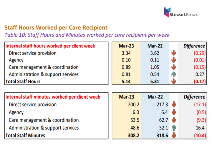 StewartBrown data for the March 2023 quarter shows a continuation in the downward trajectory of staff hours spent each week with clients. Staff spent 5.14 hours per care recipient in the three months, down from 5.31 hours for the March 2022 quarter...