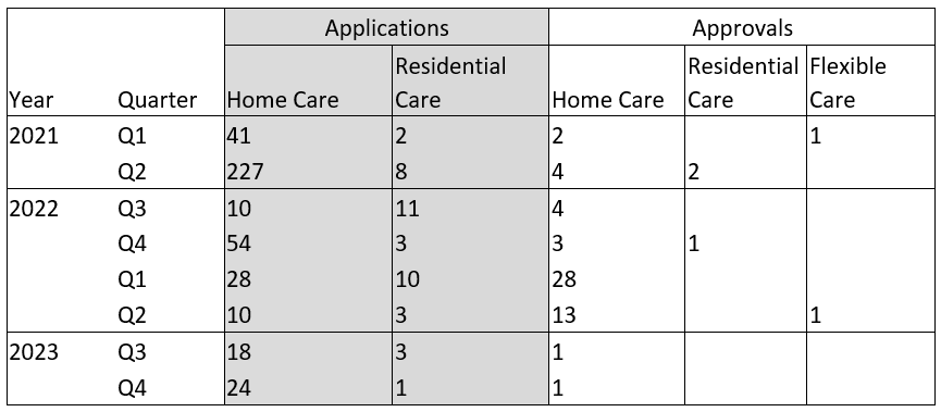 In the June quarter, not one application to become a residential aged care provider was approved by the Aged Care Quality and Safety Commission (ACQSC), and only one application to become a home care provider received the go-ahead – despite 26 applications being lodged during the three-month period. Some applications received during the quarter might be approved in subsequent quarters, but the approval rate is startlingly low. For the entire 2022-23 financial year period, no residential aged care providers were approved out of 17 applications. 20 home care providers were approved over the year, out of 80 applications. However, the rate of approvals has fallen in the second half of the year – only two providers were approved from January to June 2023 (of 42 applications).
