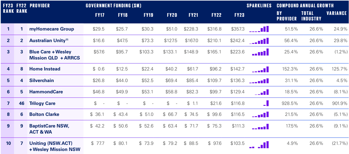- The Top 25 home care providers received 40% of Government home care funding in FY23, down from 41% in FY22, in contrast to residential aged care where the larger providers are attracting a greater share of the market.
