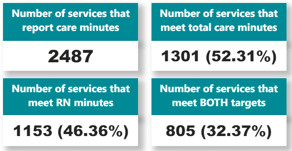 According to data for October - December 2023, released 10 April 2024, only 32.37% of providers, or 805 providers, met both RN and total care minute targets. A provider we have spoken to, who did not receive the letter but has spoken to colleagues who did, said the Aged Care Quality and Safety Commission is now getting "a lot information every quarter, so they know exactly what the care minutes are" for each provider.