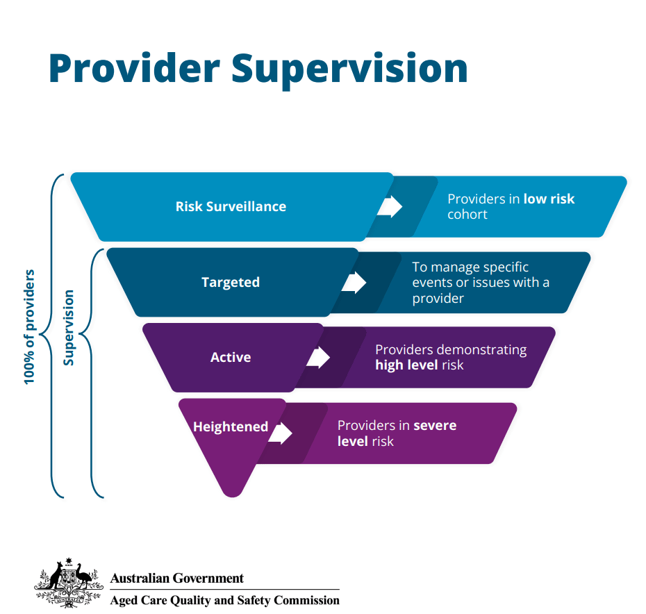 The new Strategy uses a 'provider supervision model', where the ACQSC allocates every provider a 'supervision status' based on their level of assessed risks. There are four supervisory statuses that indicate escalating intensity of commission intervention: risk surveillance, targeted, active and heightened supervision.