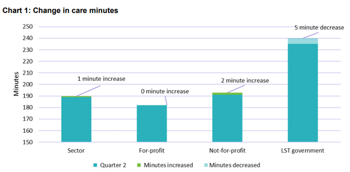 The total average care minutes per resident per day for the sector was 190 minutes, an increase of one minute per resident per day from the second quarter. The sector average care minute target for the March quarter was 196 minutes so providers are behind. Mandatory requirements for 200 care minutes per resident per day come into effect on 1 October.