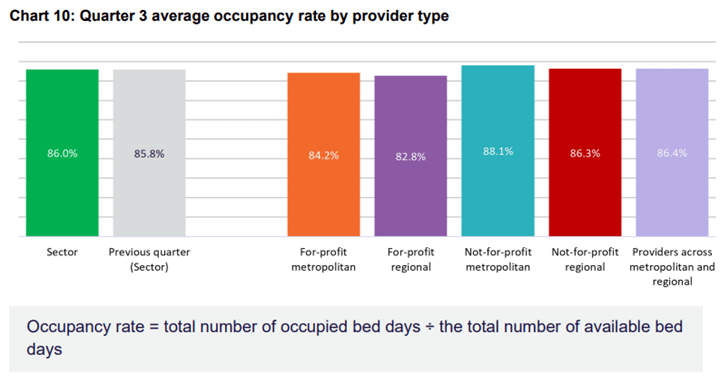 Occupancy, which was included in the 38-page report for the first time, was only 86.0%, with Not For Profit providers recording higher rates of occupancy on average than their For Profit counterparts.
