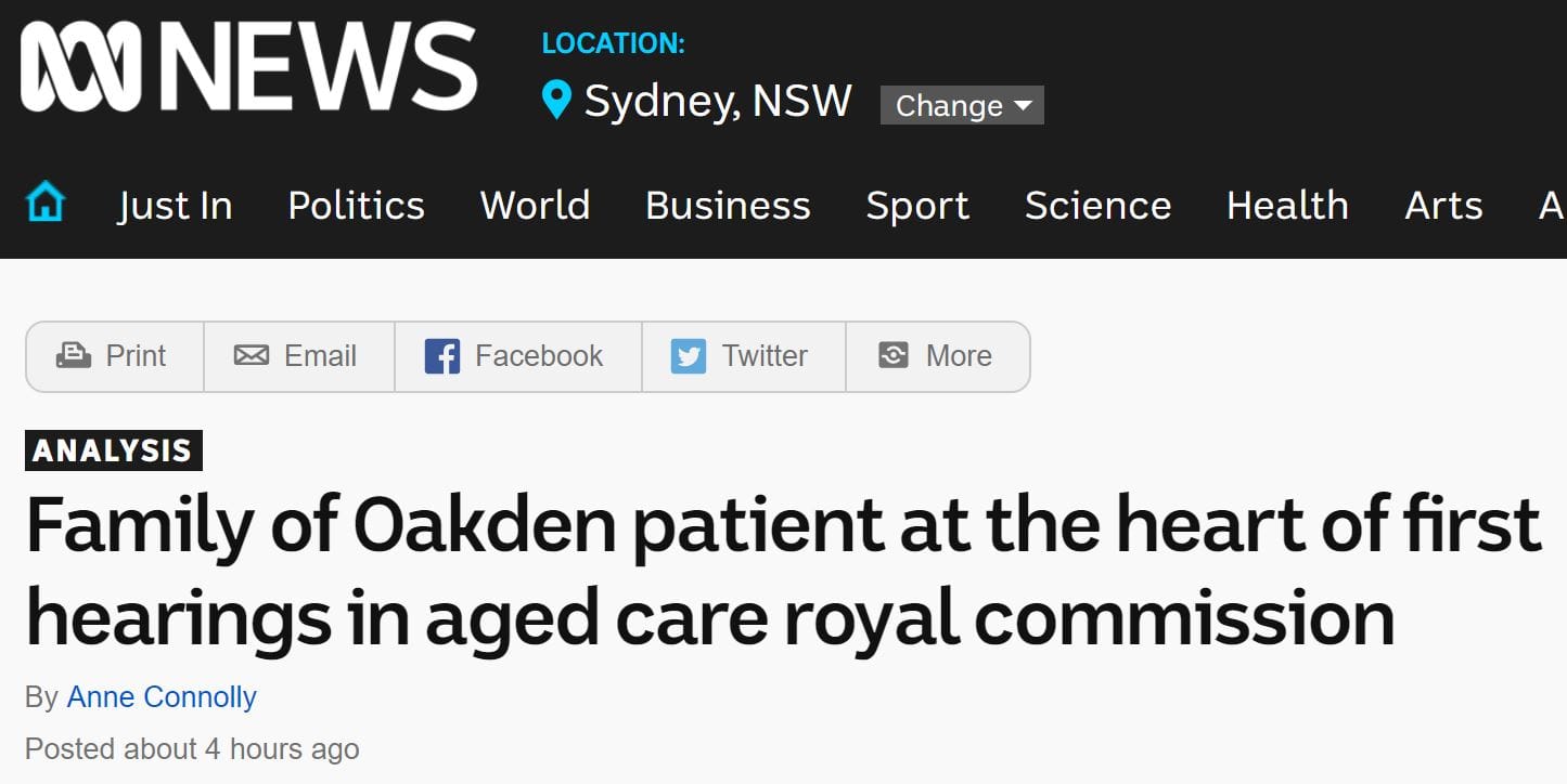 “This is a very important point you make” commented Senior Counsel Assisting Peter Gray SC. Mr Yates was on the stand for three hours. (You will be able to hear Ian’s update on the Royal Commission at our LEADERS SUMMIT - 21 & 22 March at the Hyatt Regency Sydney). John McCallum, CEO and research director at National Seniors Australia, had just 30 minutes on stand. His major message was the need for one representative body instead of three. A Current Affair TV crew was their pursuing the Spriggs family. The ABC had TV as well as up to four reporters on site. Their initial post is little on the Royal Commission and more on a revisit to Oakden. You can check it out