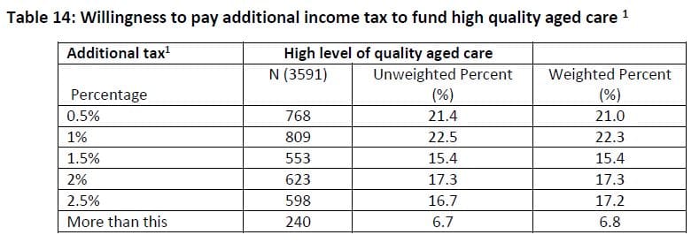 Two-third of those survey were taxpayers, with 61% of those indicating they would be willing to pay more income tax (in a form such as the Commission’s proposal for a Medicare-style levy) to support a quality aged care system. On average, current income taxpayers said they would be willing to pay an additional 1.4% income tax per year, plus another 1.7% per year (for a total rise of 3.1%) to achieve high quality aged care (the Royal Commission’s recent financing consultation paper has proposed a 1% or 2% increase in income taxes to fund the system).