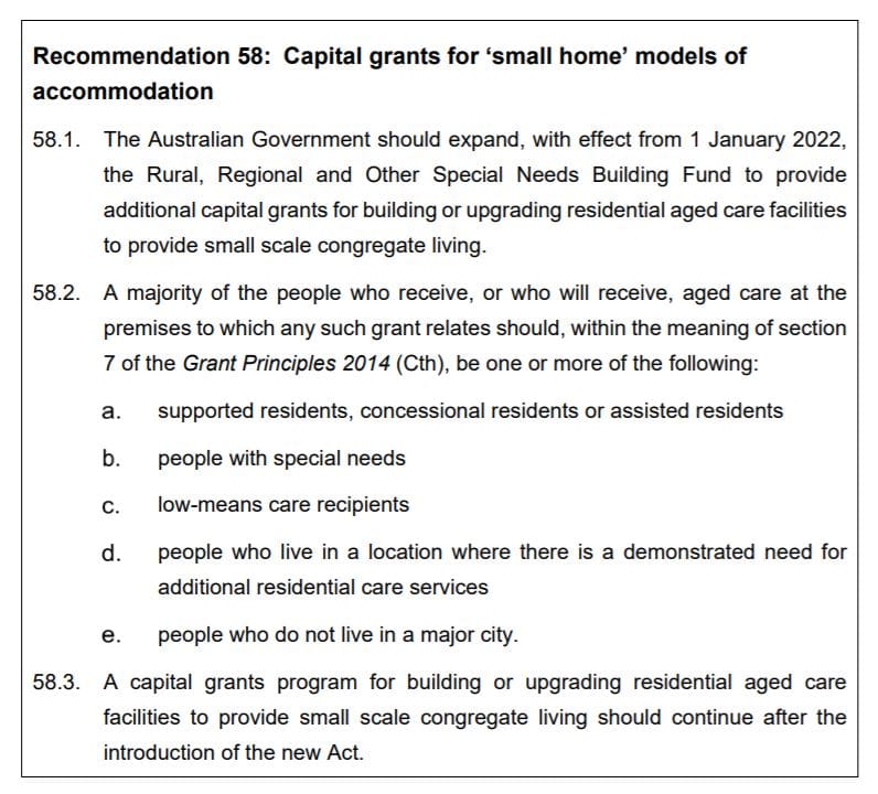This process would be supported by: Recommendation 58: Capital grants for ‘small home’ models of accommodation This would see the Rural, Regional and Other Special Needs Building Fund expanded from 1 January 2022 – 14 months away – to provide additional capital grants for building or upgrading residential aged care facilities to provide small scale congregate living. Mr Rozen added that smaller-scale accommodation didn’t have to be provided by smaller-scale providers – and larger-scale operators may be better equipped in terms of workforce to adapt to this model of accommodation.
